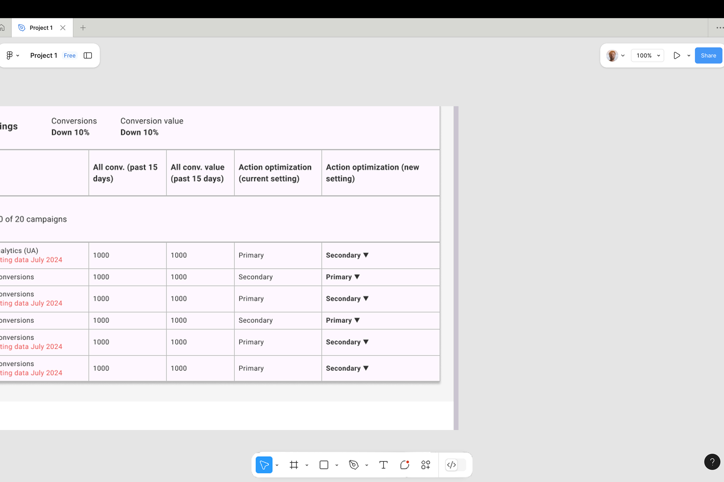The biggest headache was the individual conversion updates. We showed users a table with all their conversions and dropdown menus to switch between "Primary" and "Secondary" settings. It felt comprehensive, but was actually a mess.